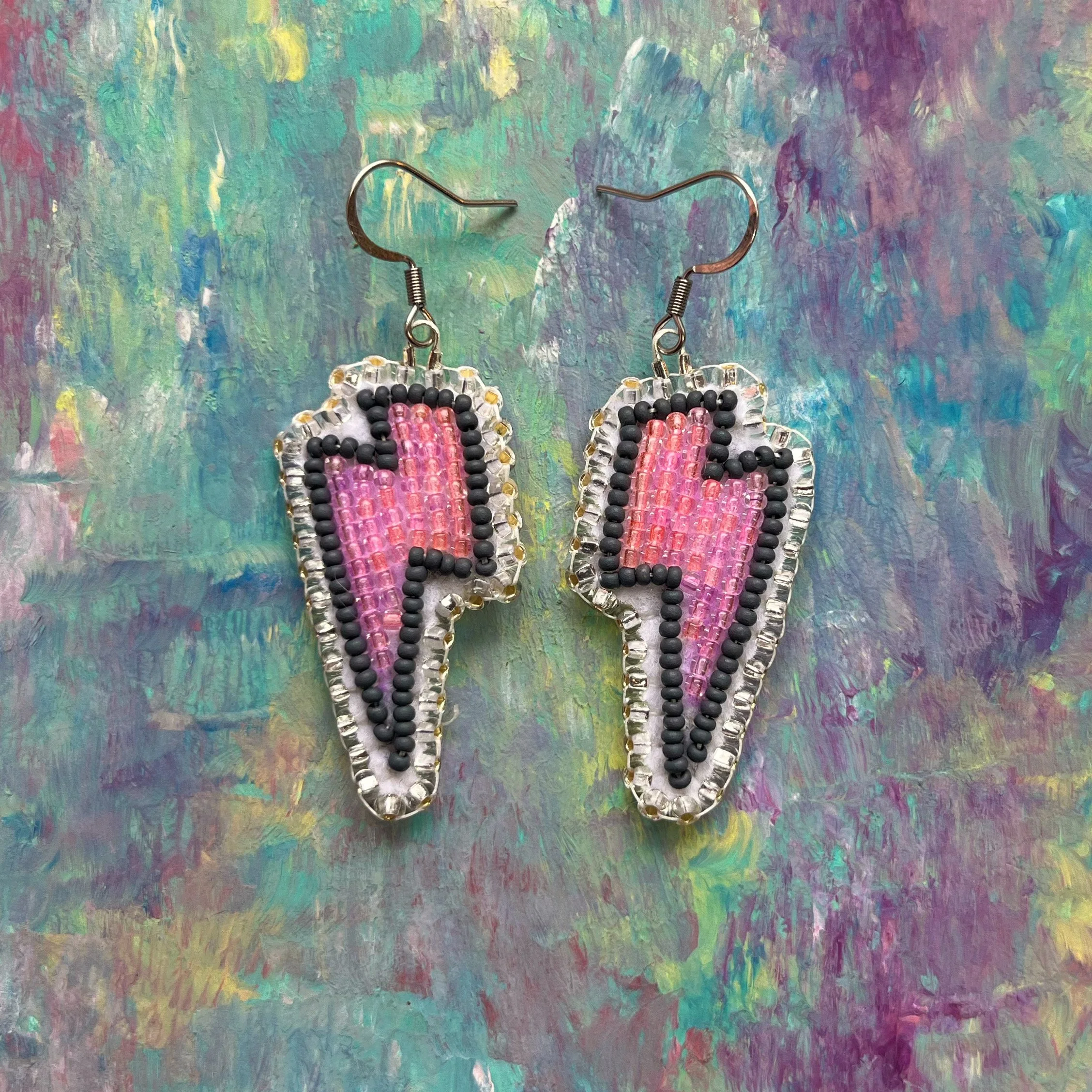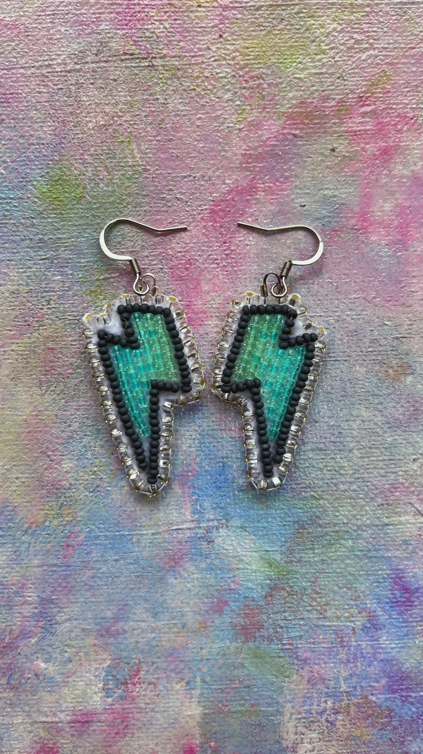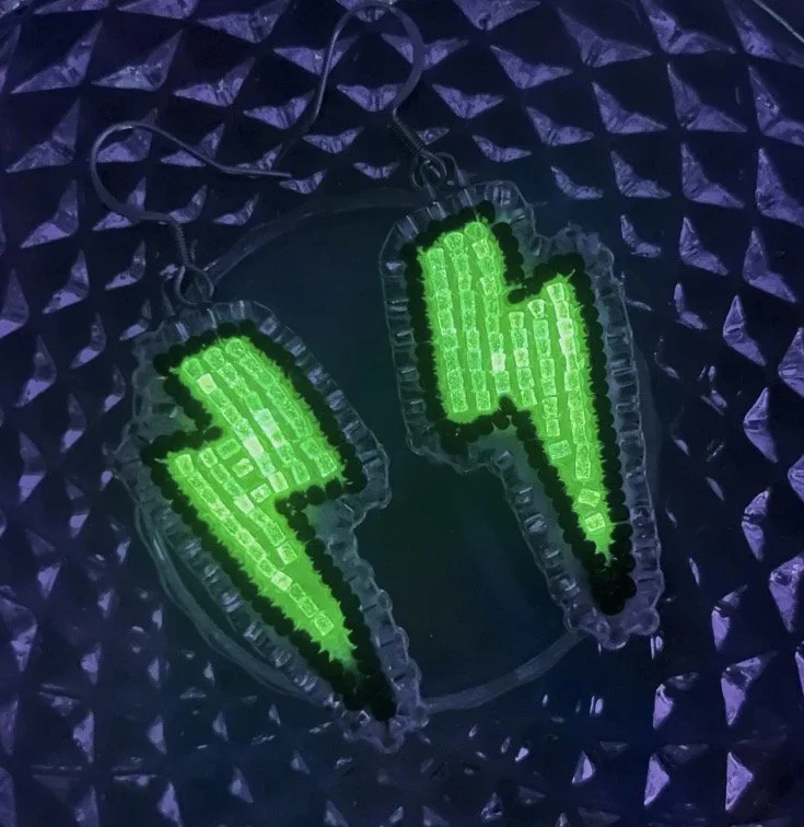 Headed using 10/0 glow in the dark glass seed beads, backed with white vinyl, and hung from hypoallergenic surgical steel hooks.