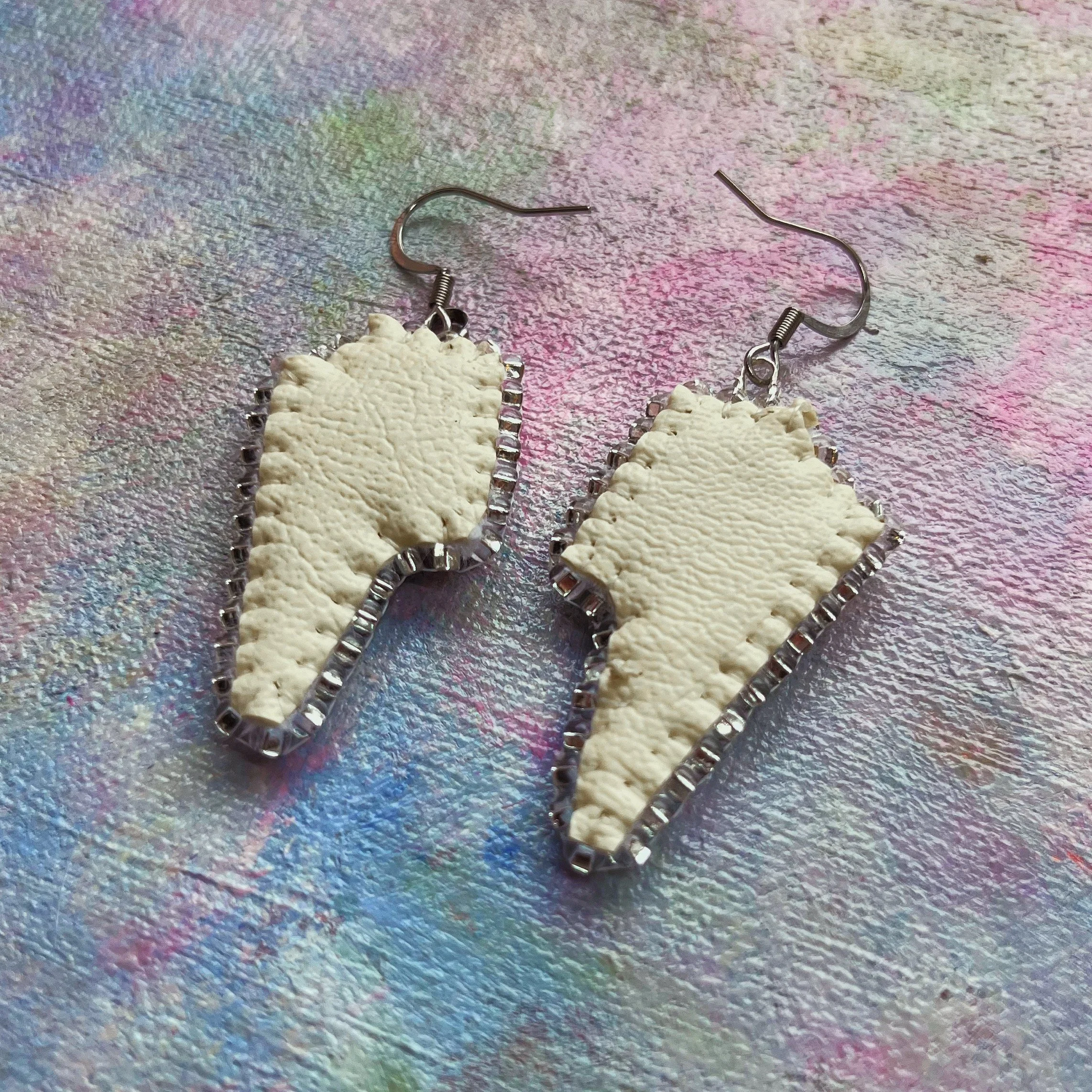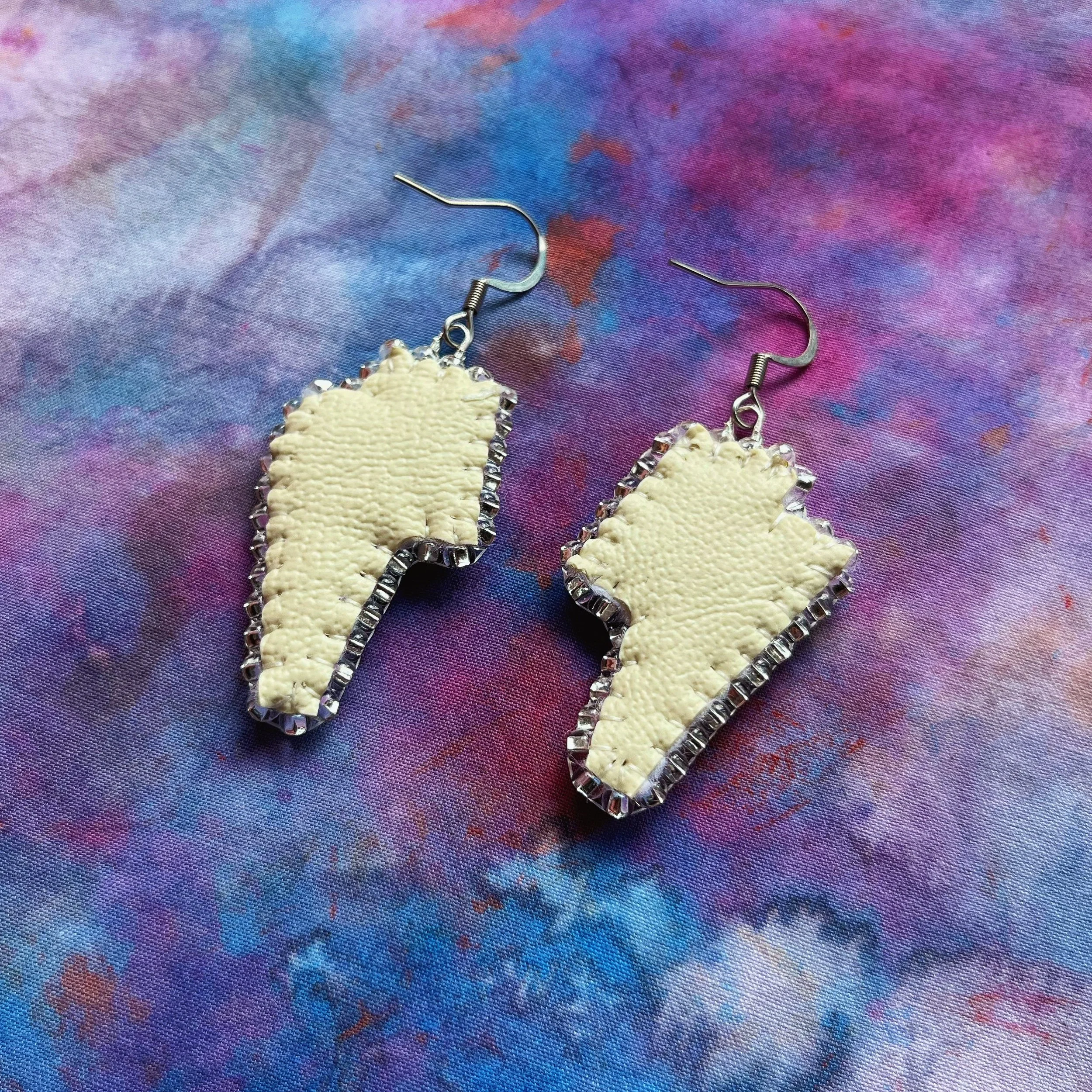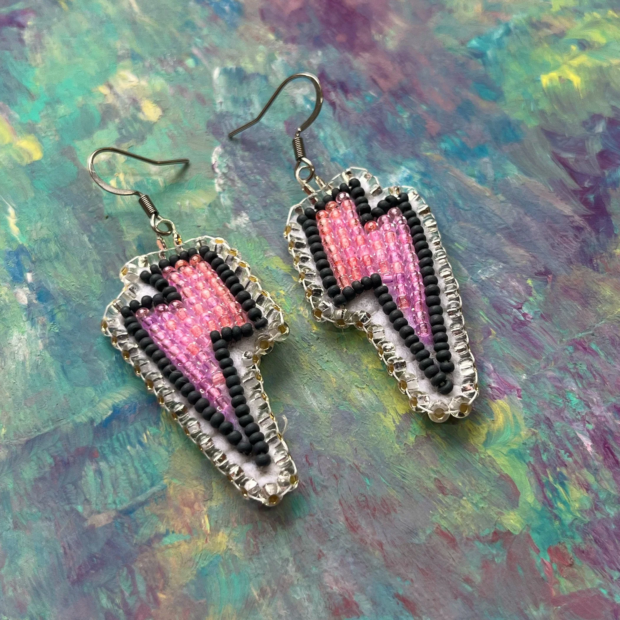 Headed using 10/0 glow in the dark glass seed beads, backed with white vinyl, and hung from hypoallergenic surgical steel hooks.