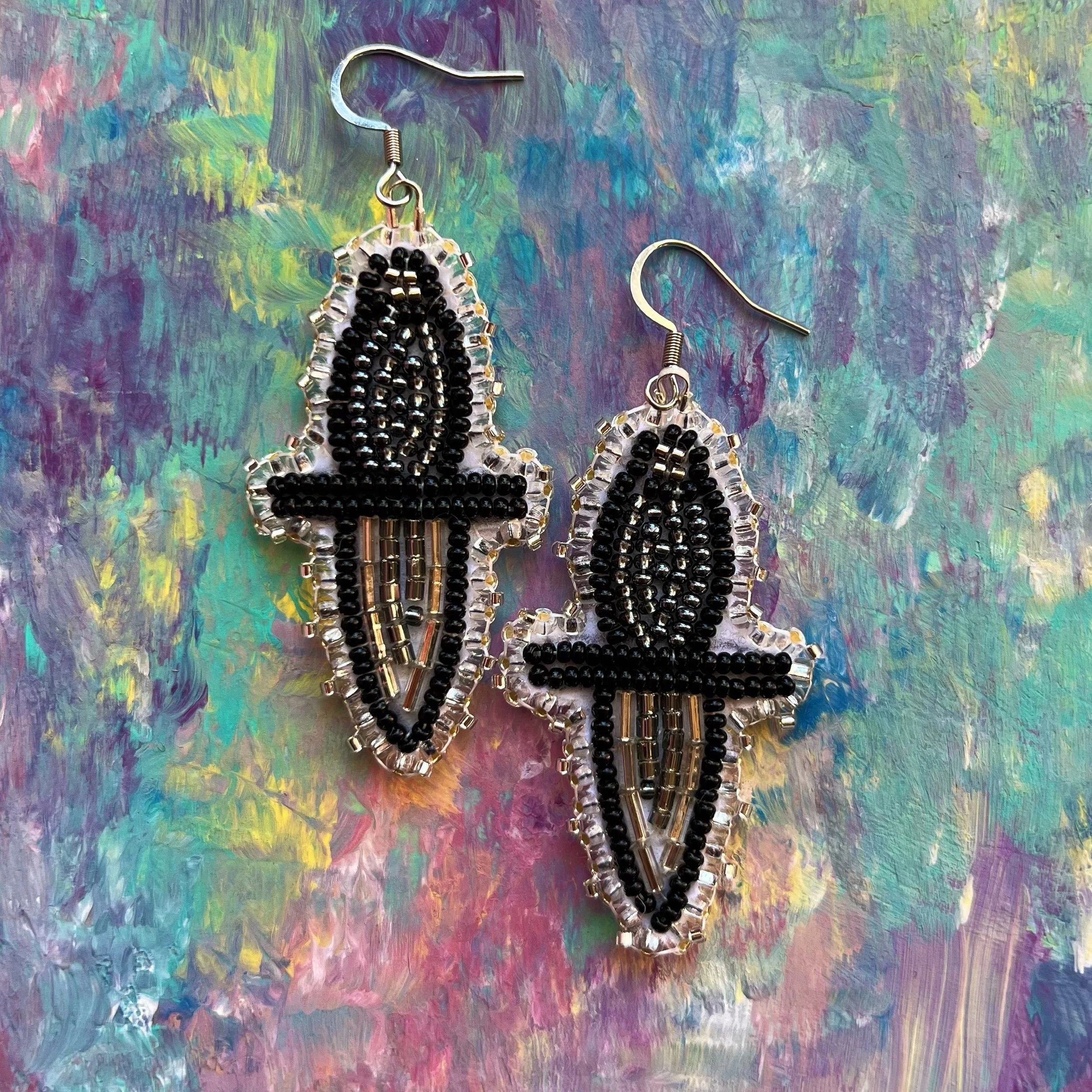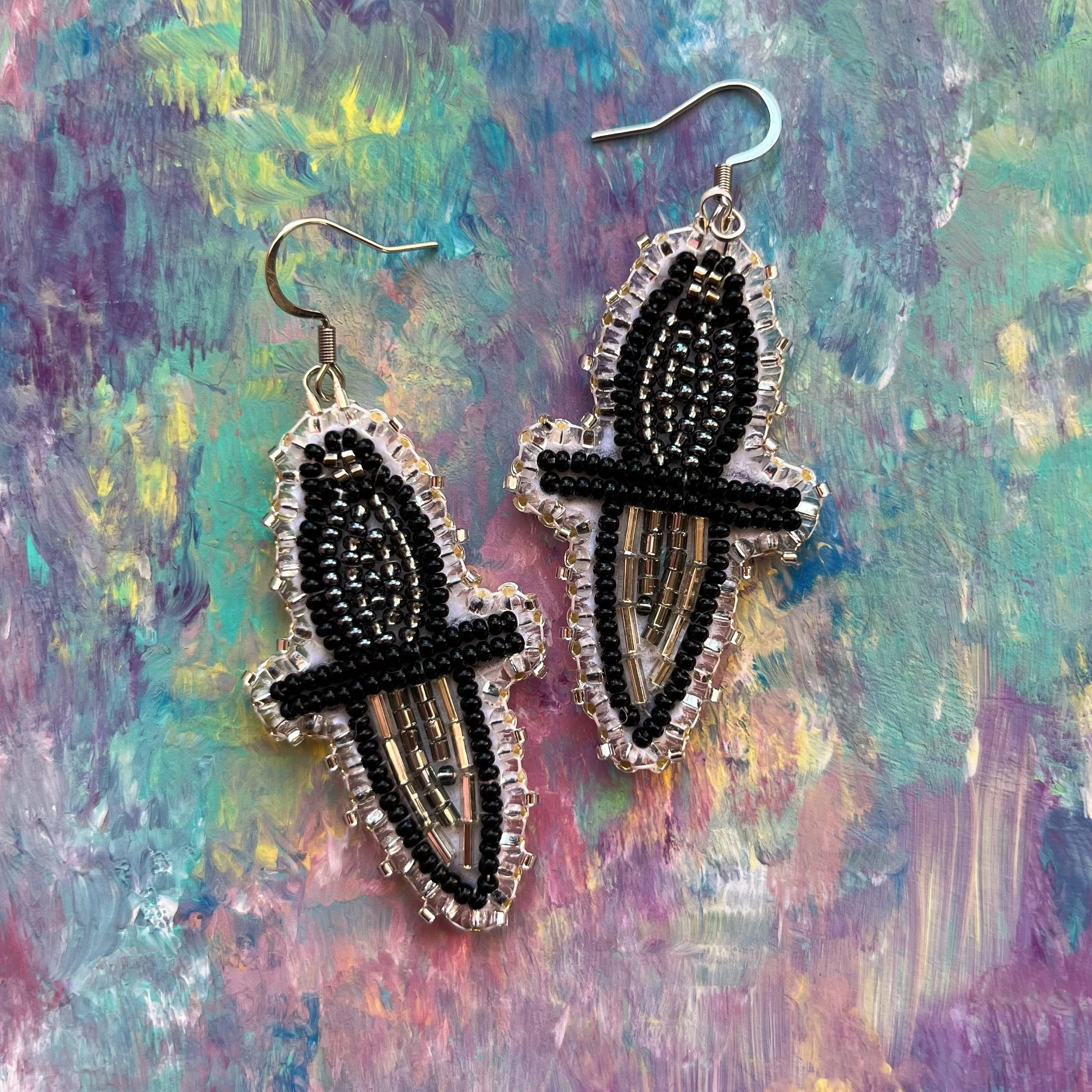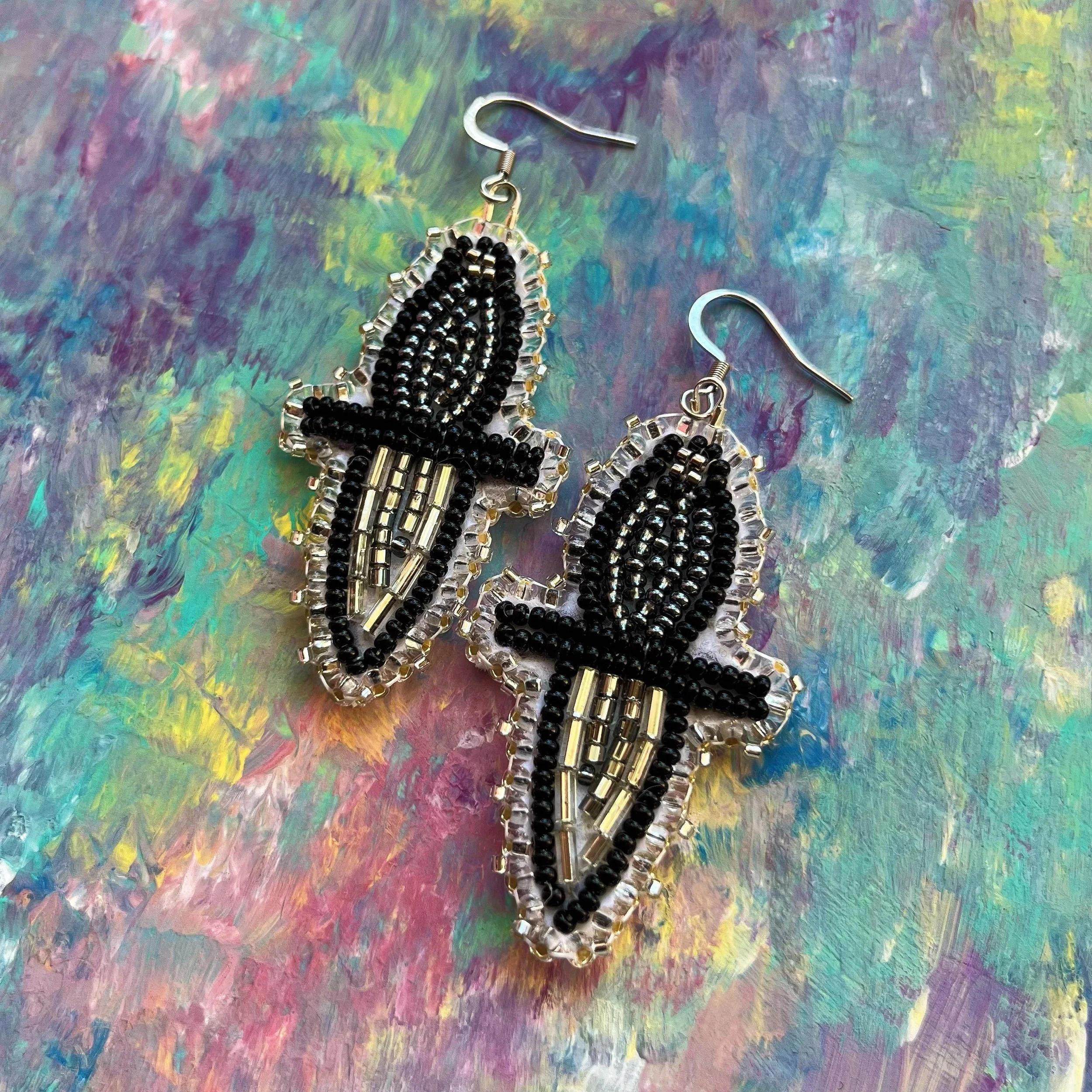 Beaded by hand with 11/0 glass seed beads and backed with white sparkly felt on hypoallergenic surgical steel hooks.