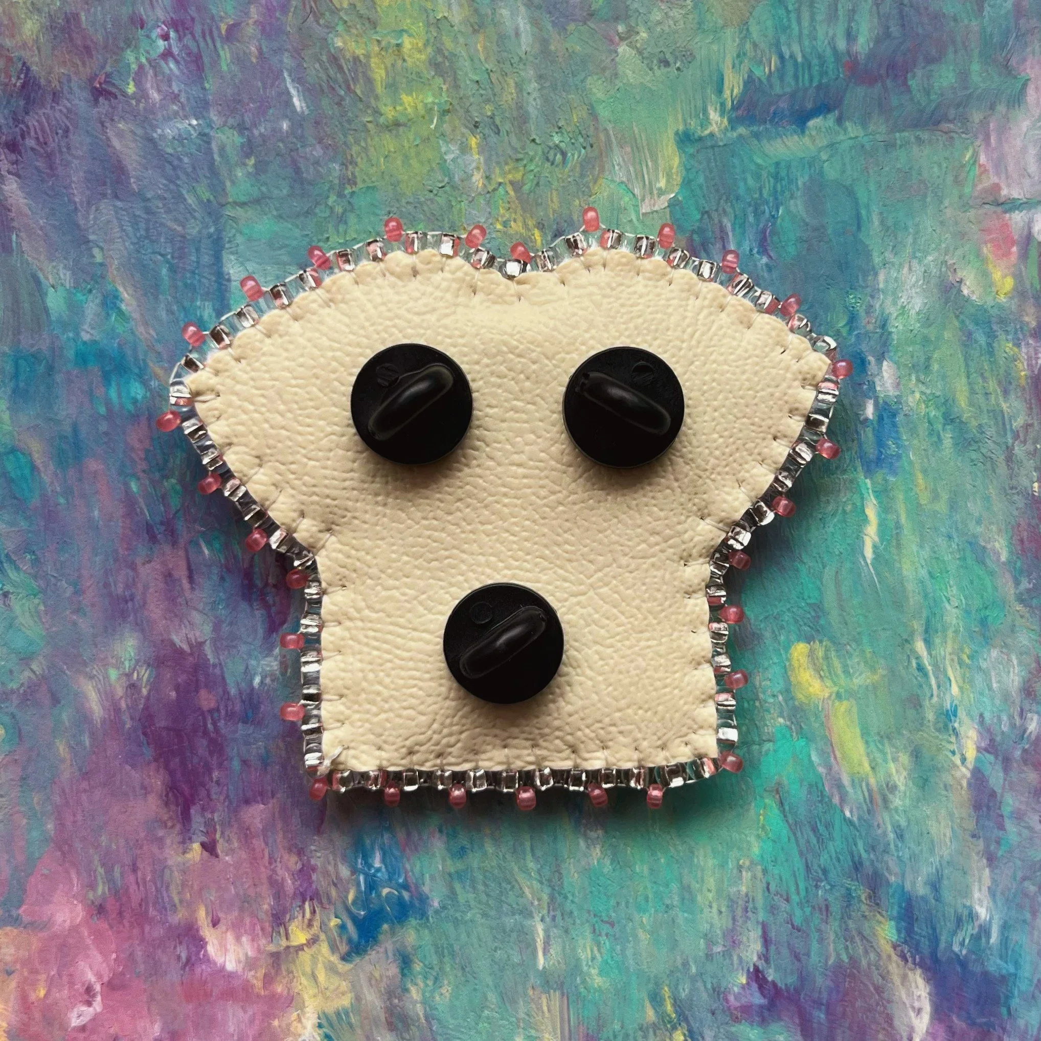 Beaded with 11/0 glass seed beads and backed with white vinyl . Attachable to your favourite jackets, banners, bags, and more by secure pin backs.