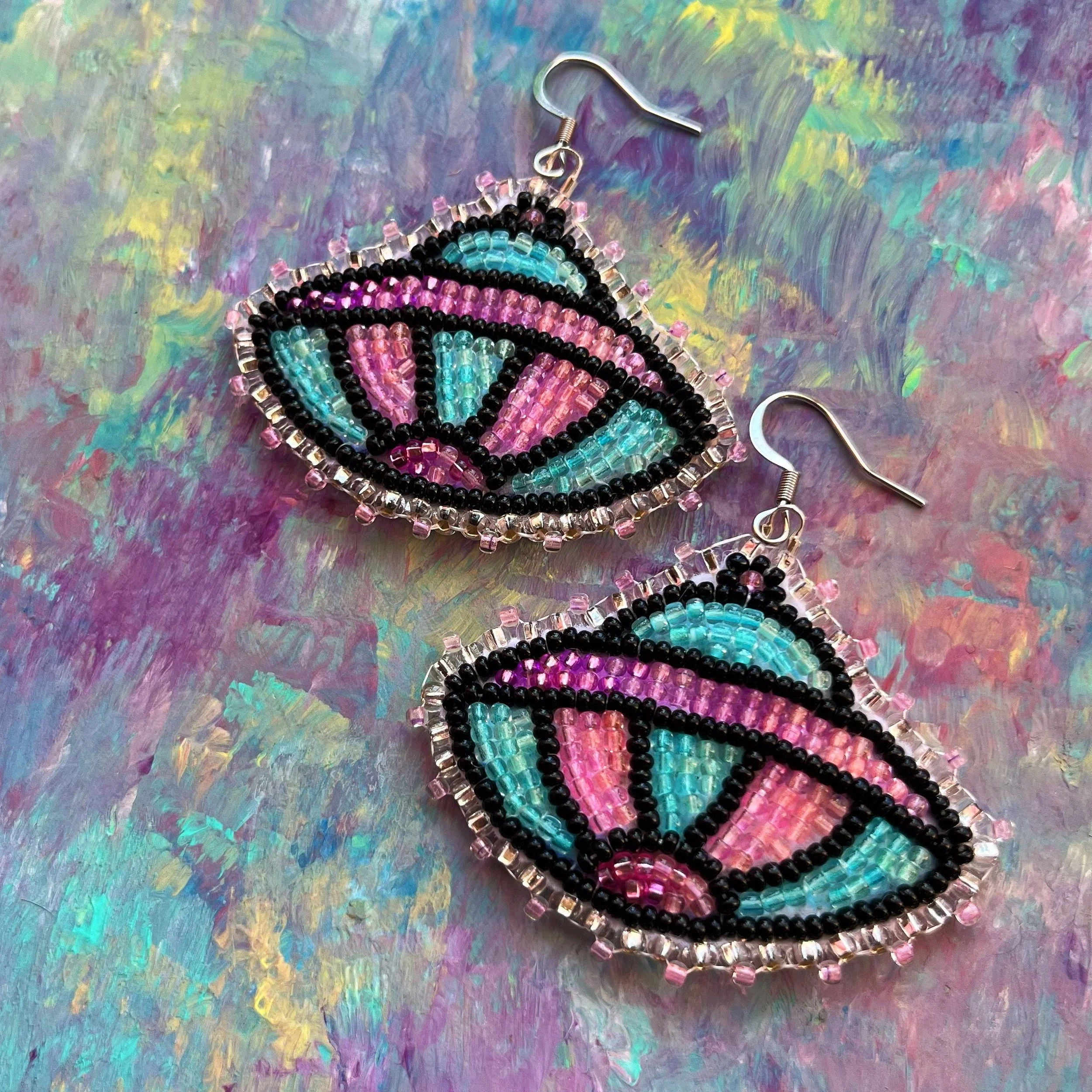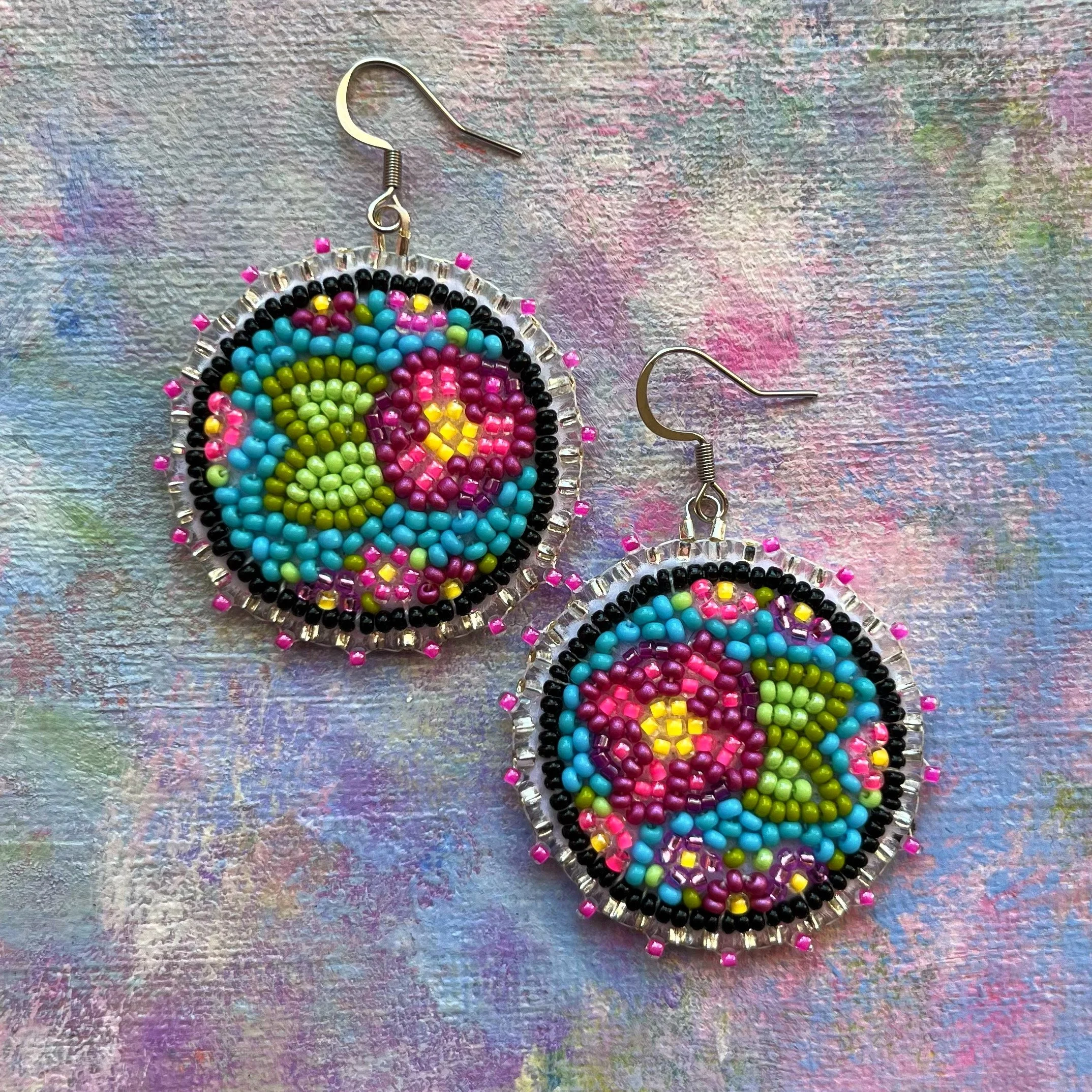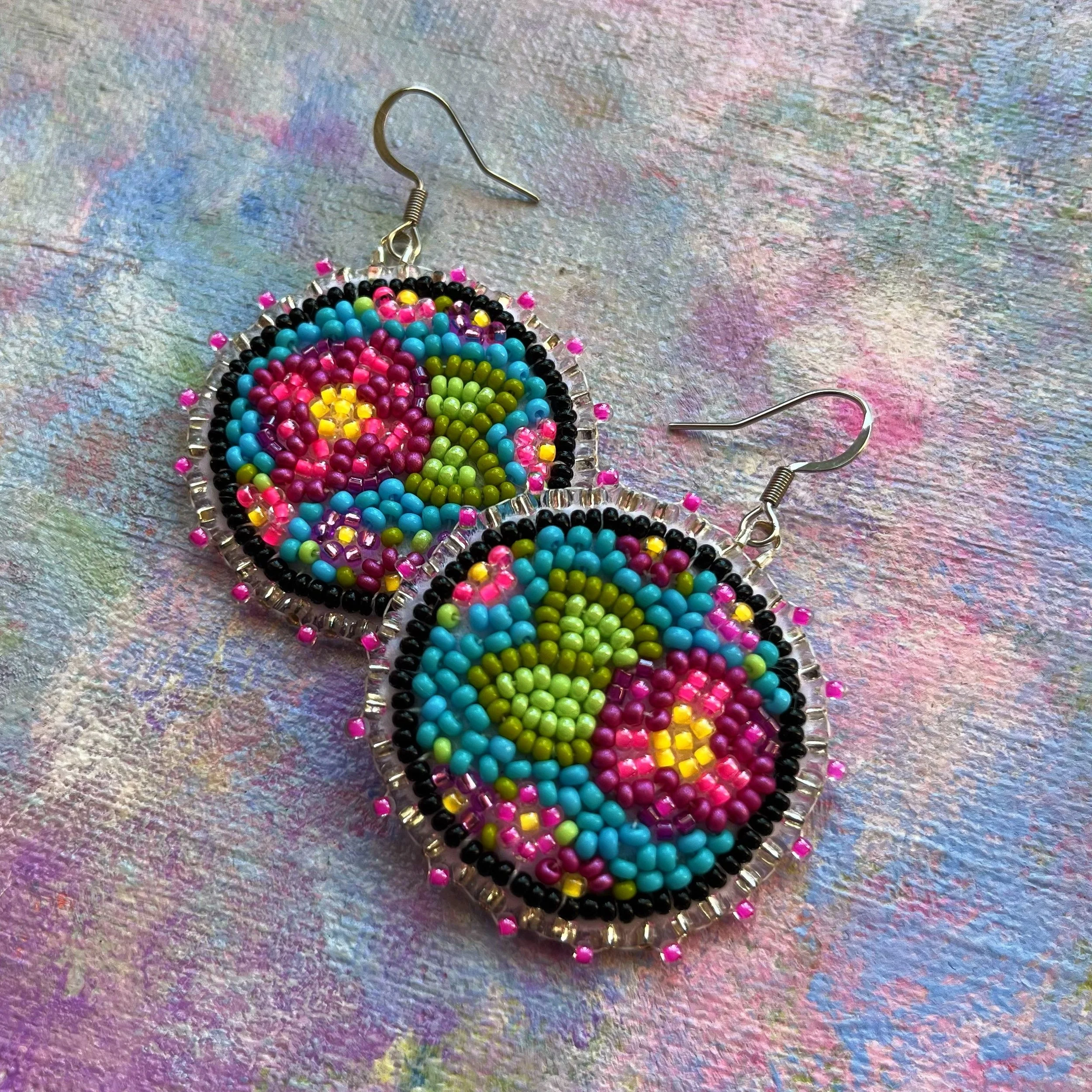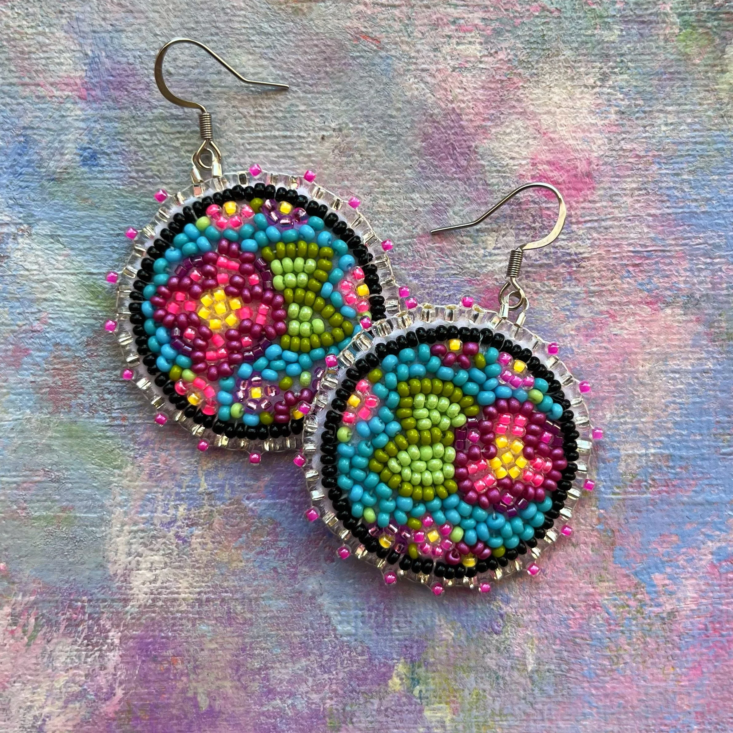 Beaded by hand with 11/0 glass seed beads and backed with white vinyl felt on hypoallergenic surgical steel hooks.