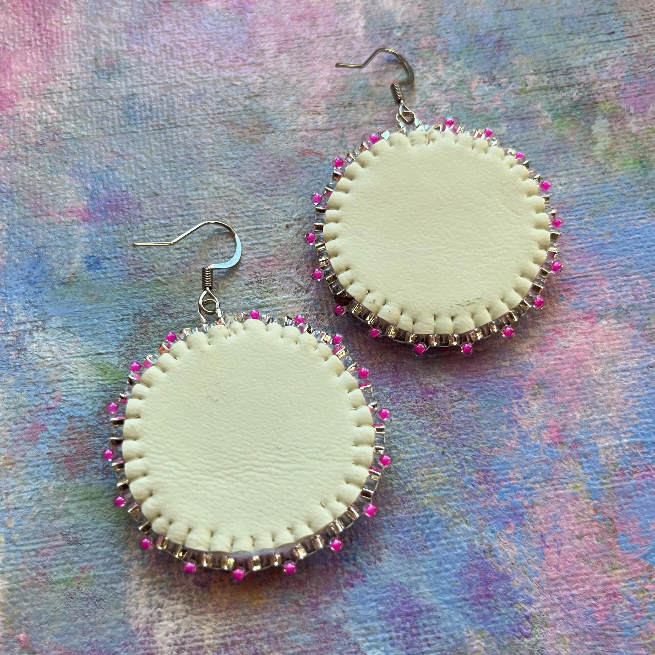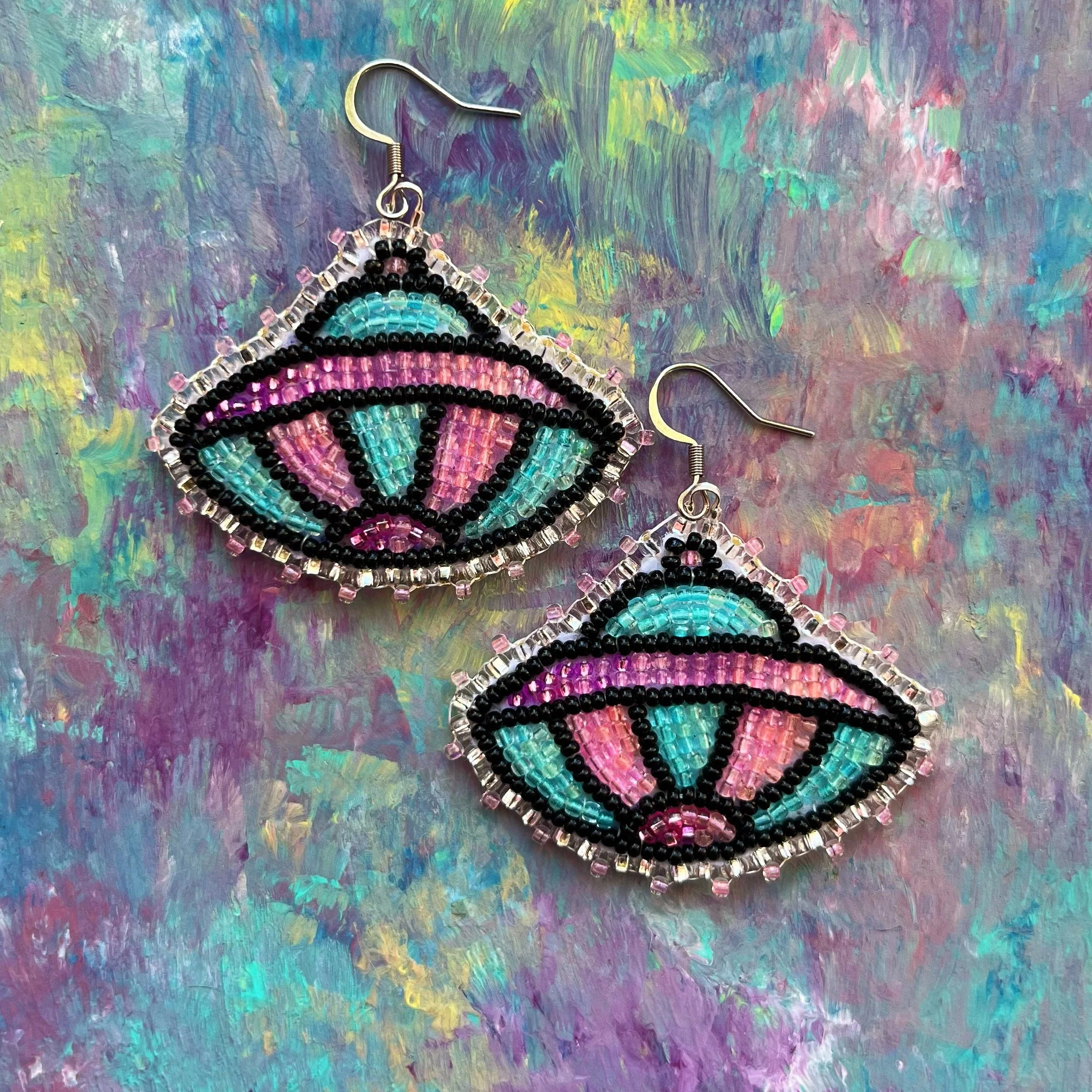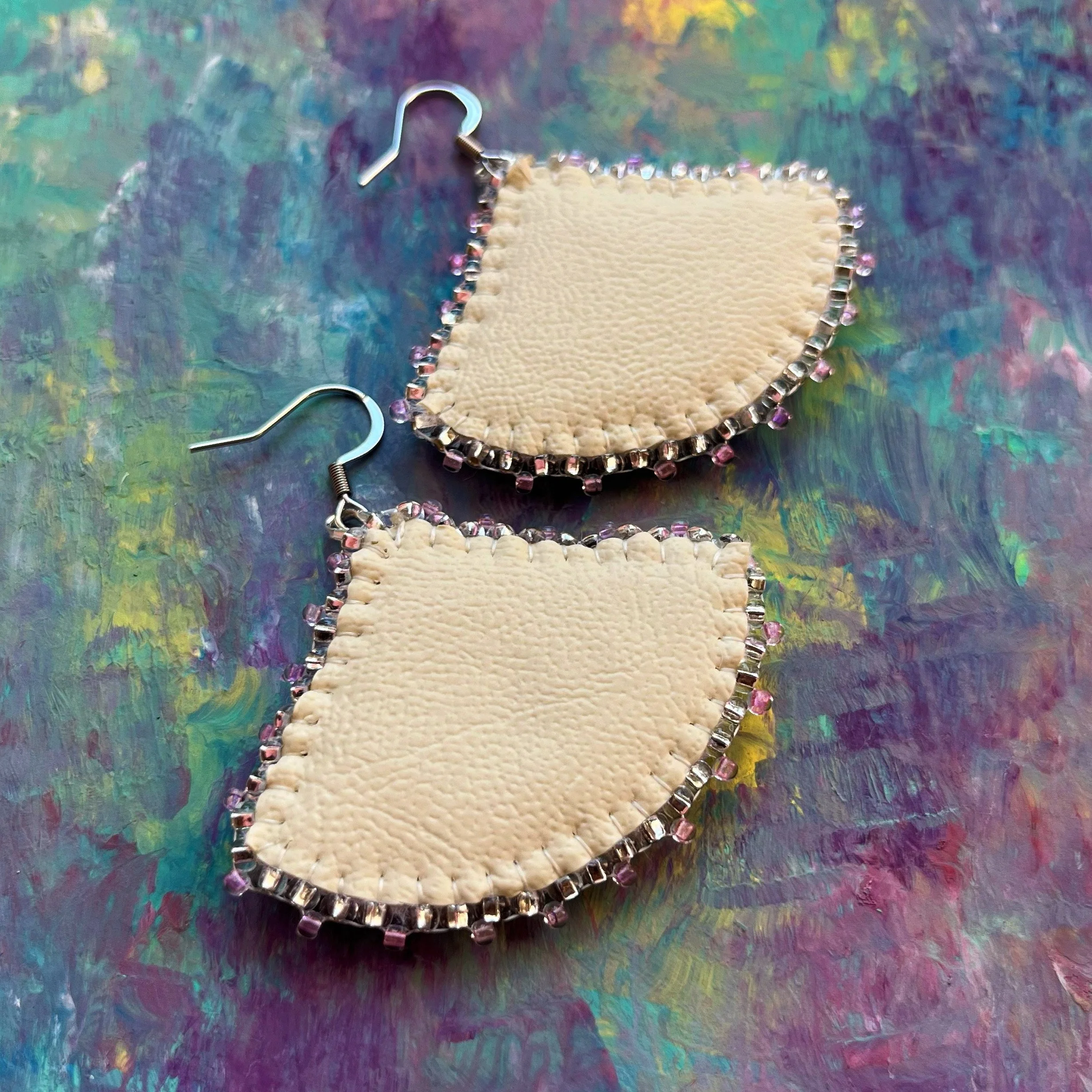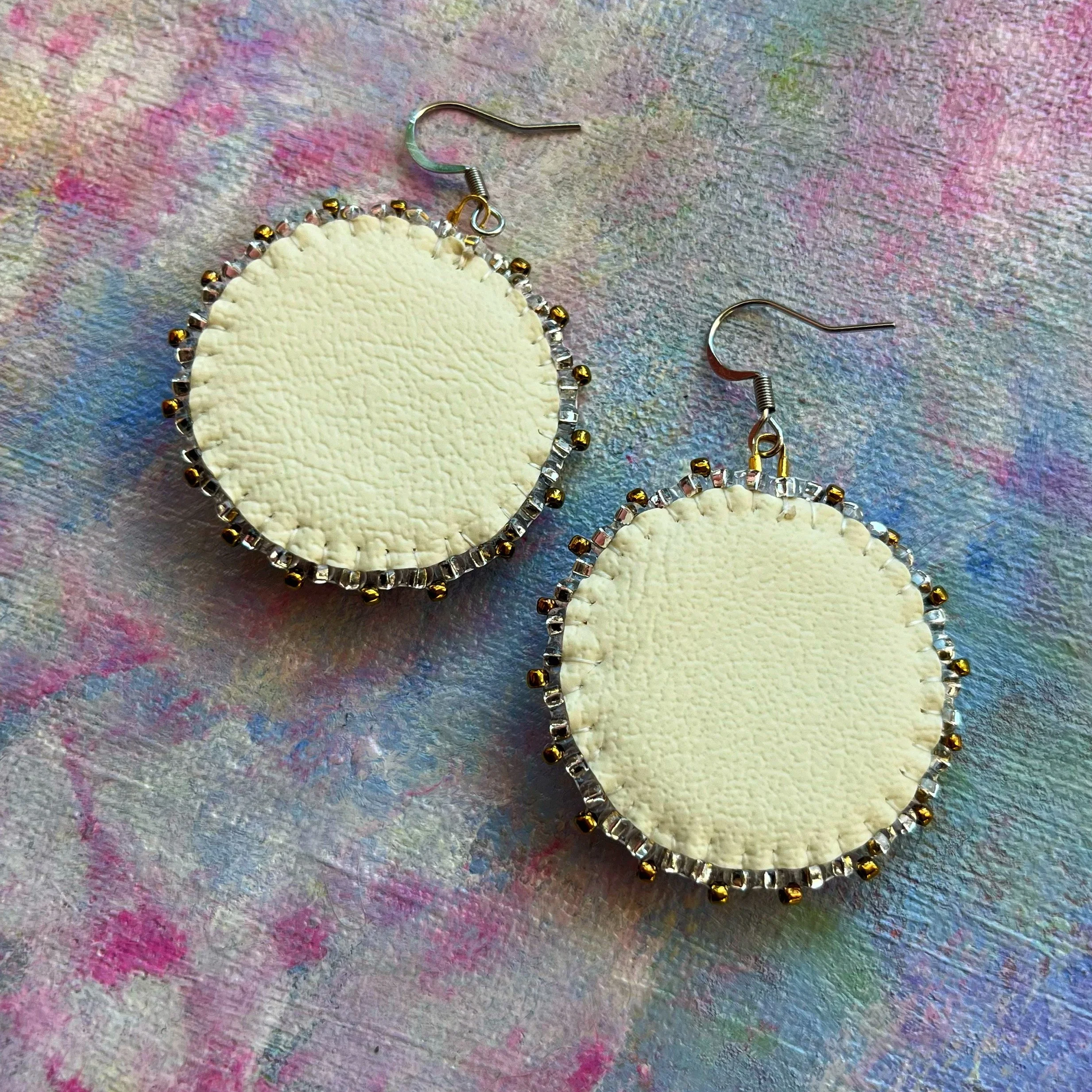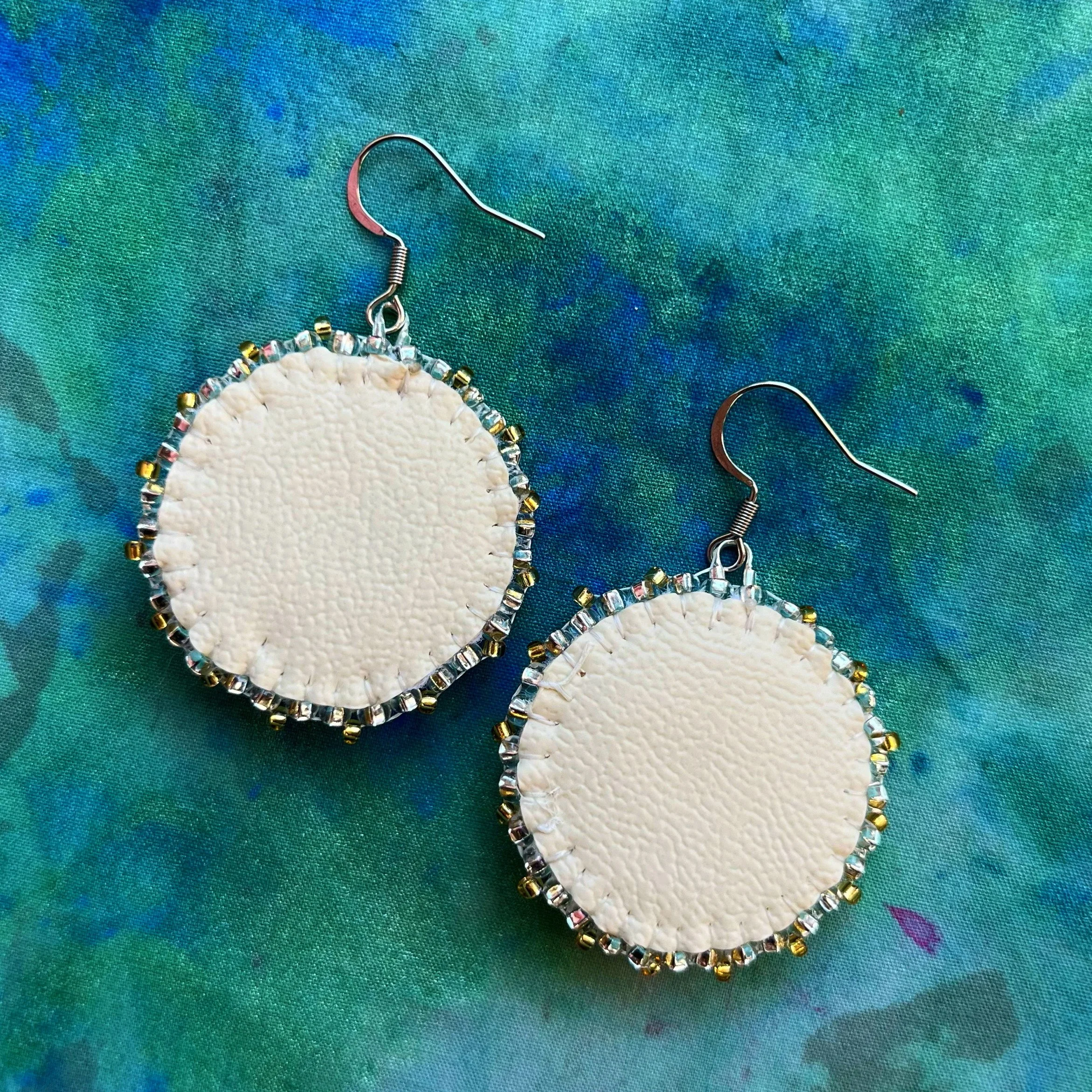 Beaded by hand with 11/0 glass seed beads and backed with white vinyl felt on hypoallergenic surgical steel hooks.