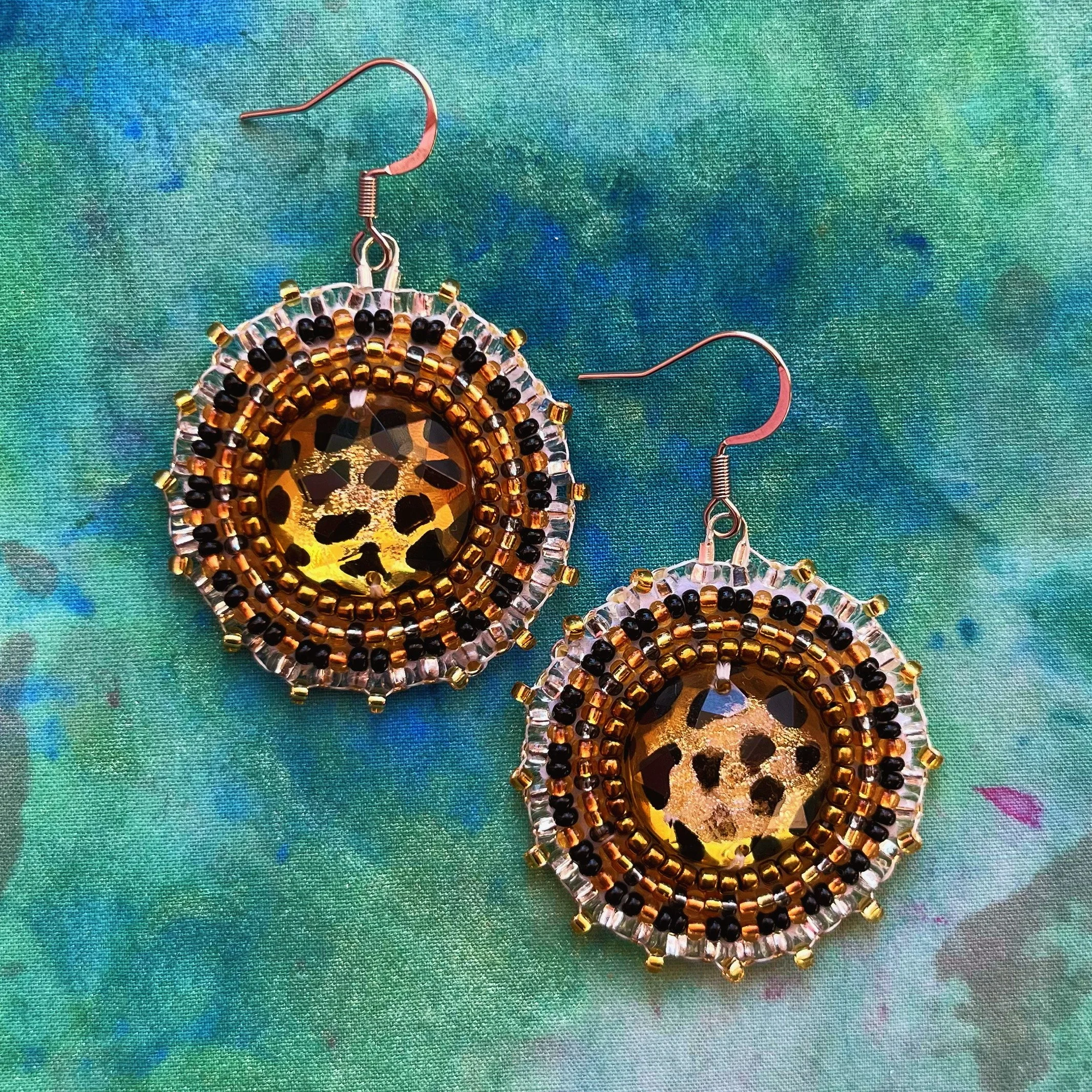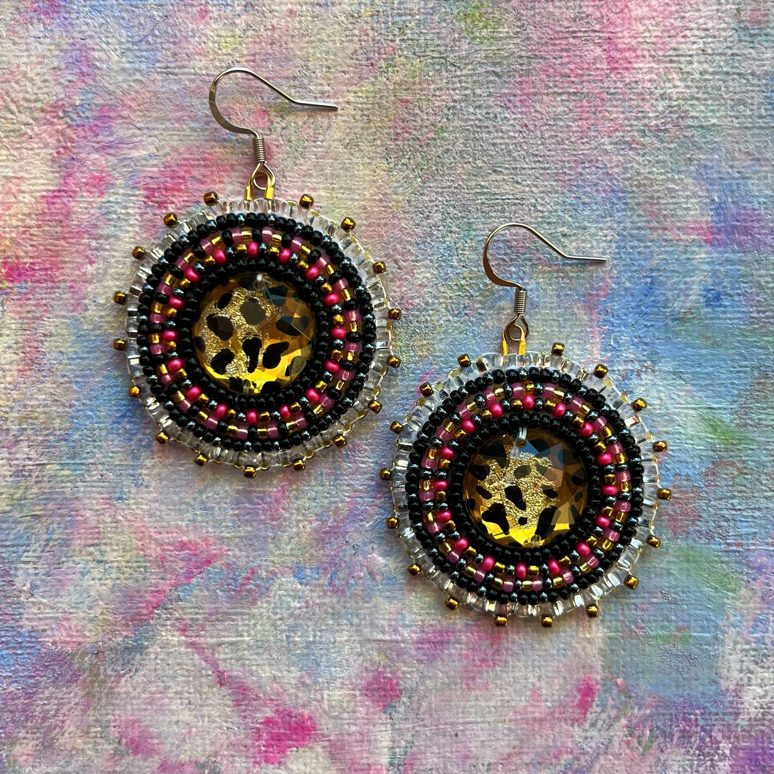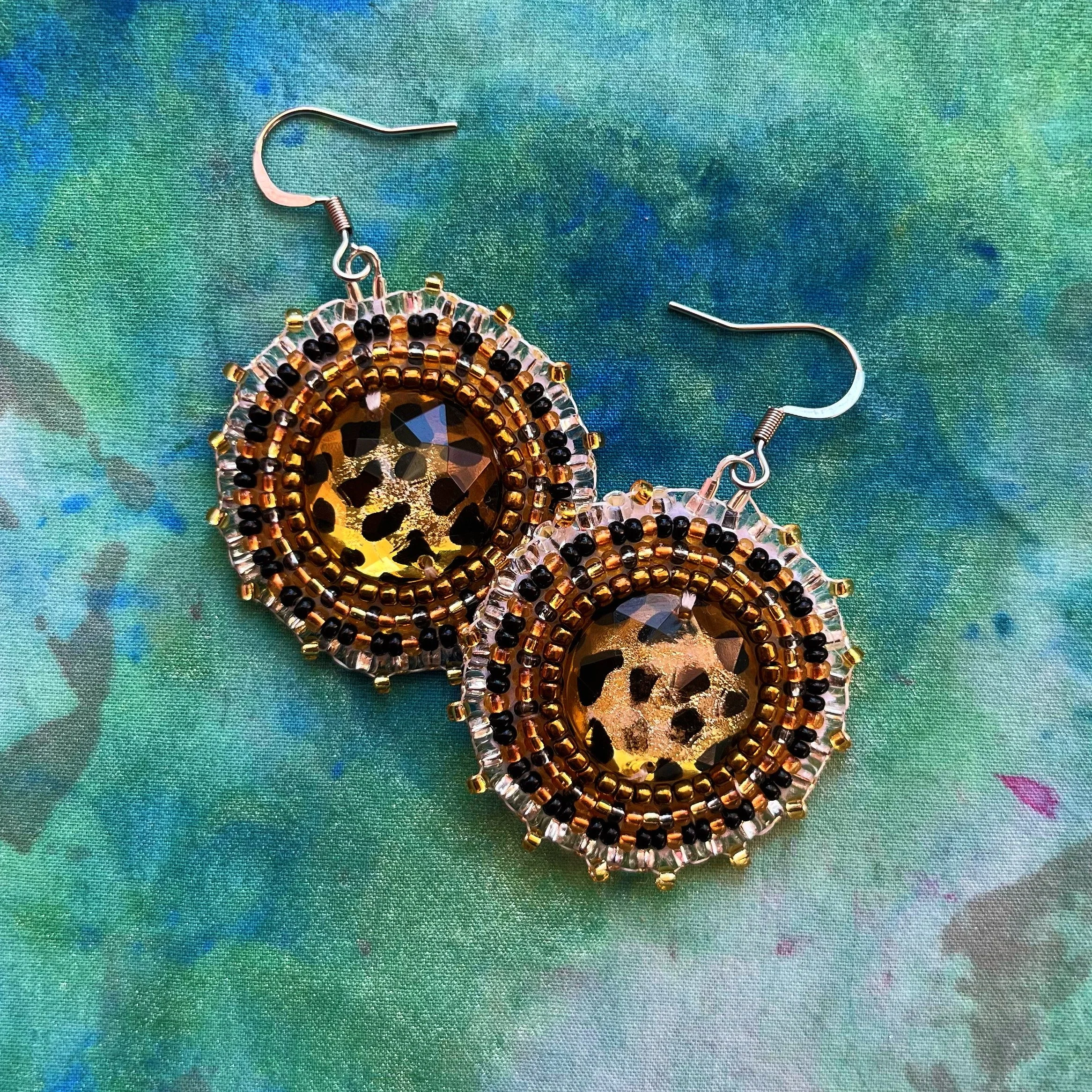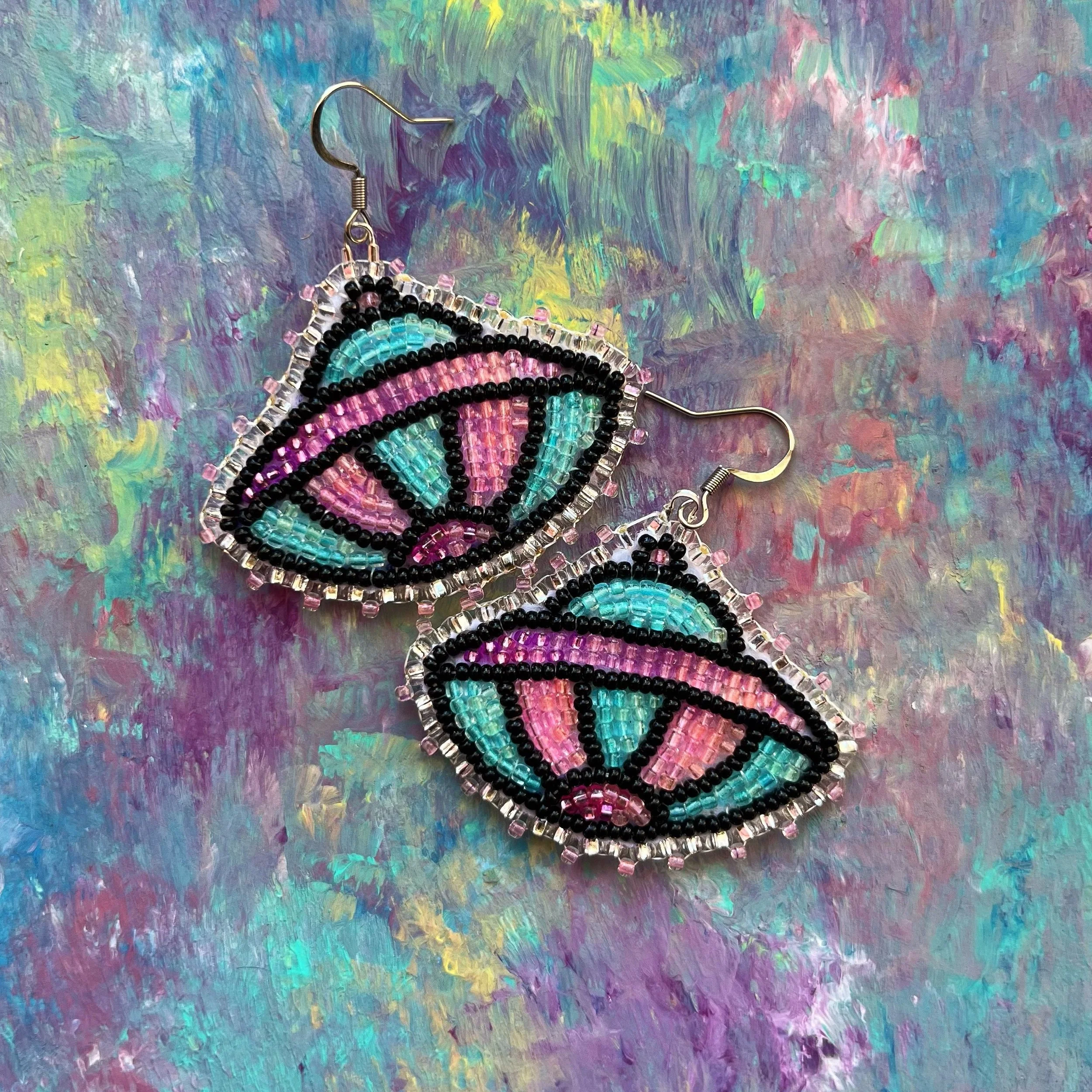 Beaded by hand with 11/0 glass seed beads and backed with white vinyl felt on hypoallergenic surgical steel hooks.