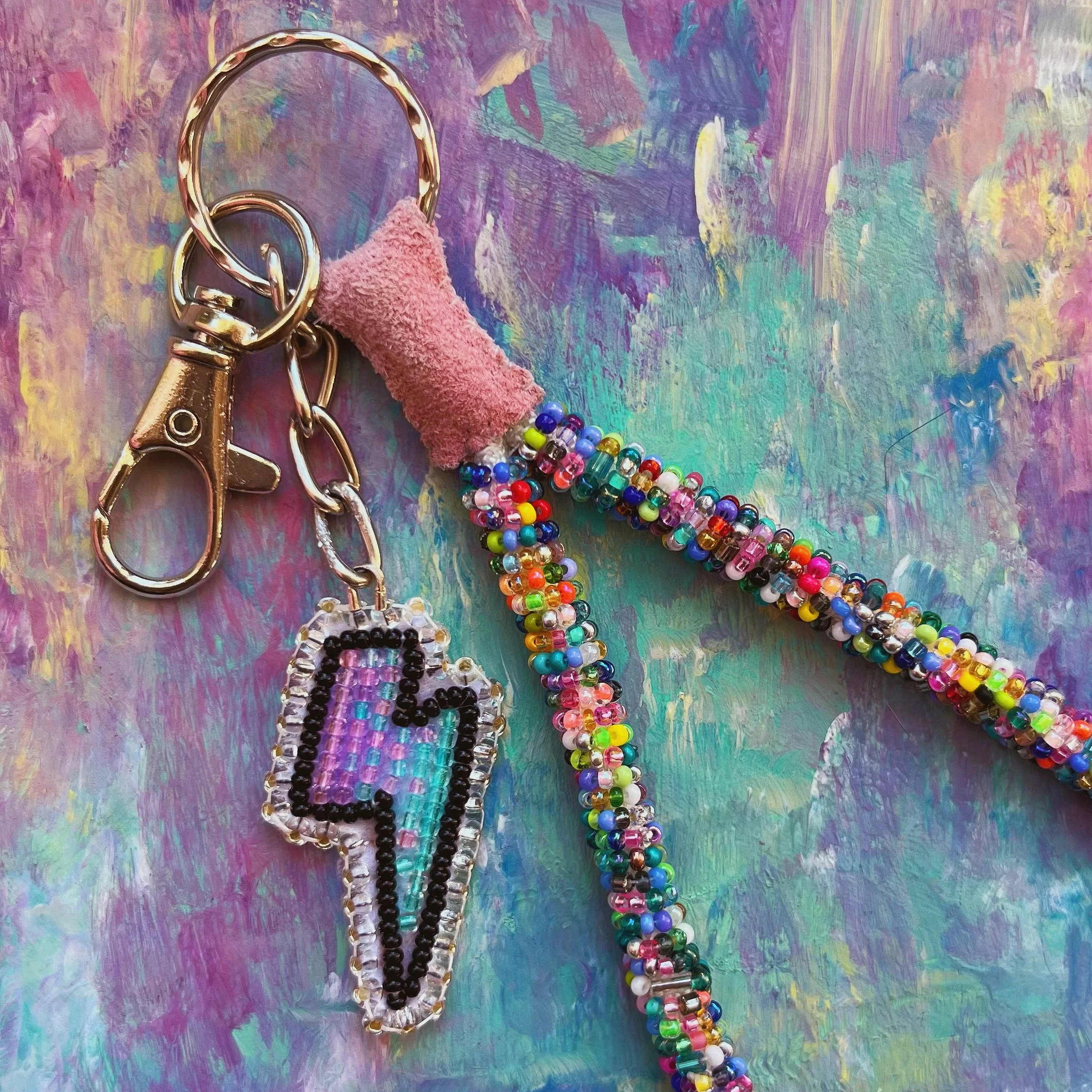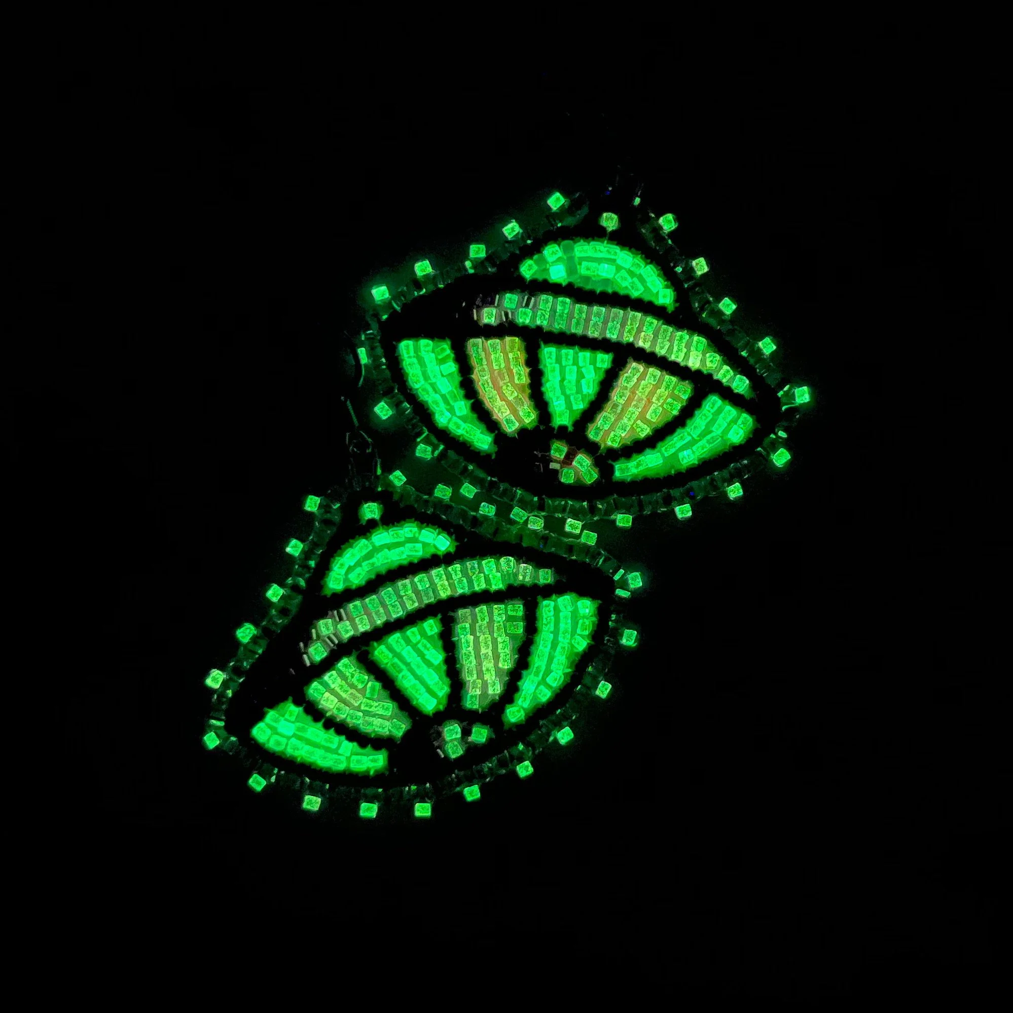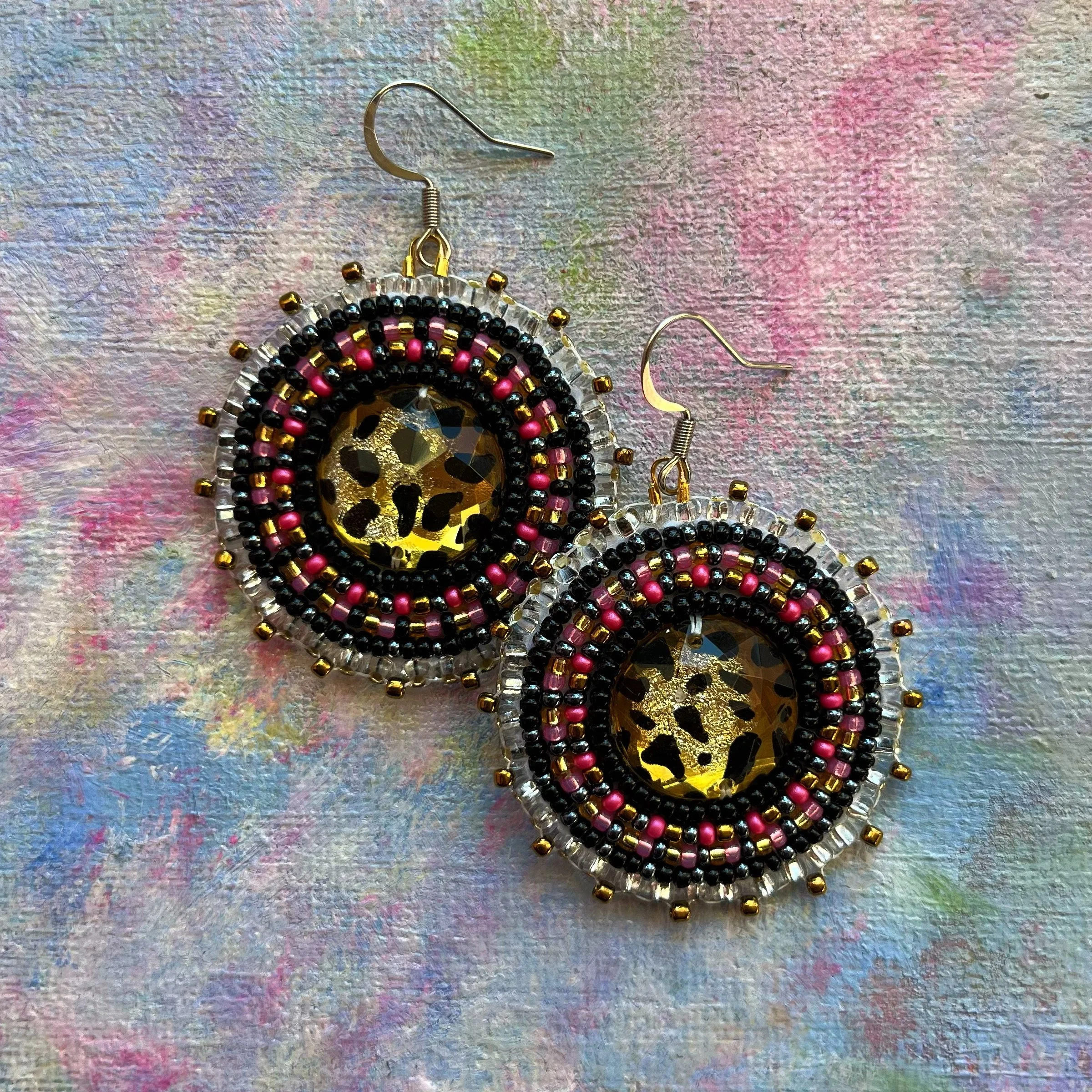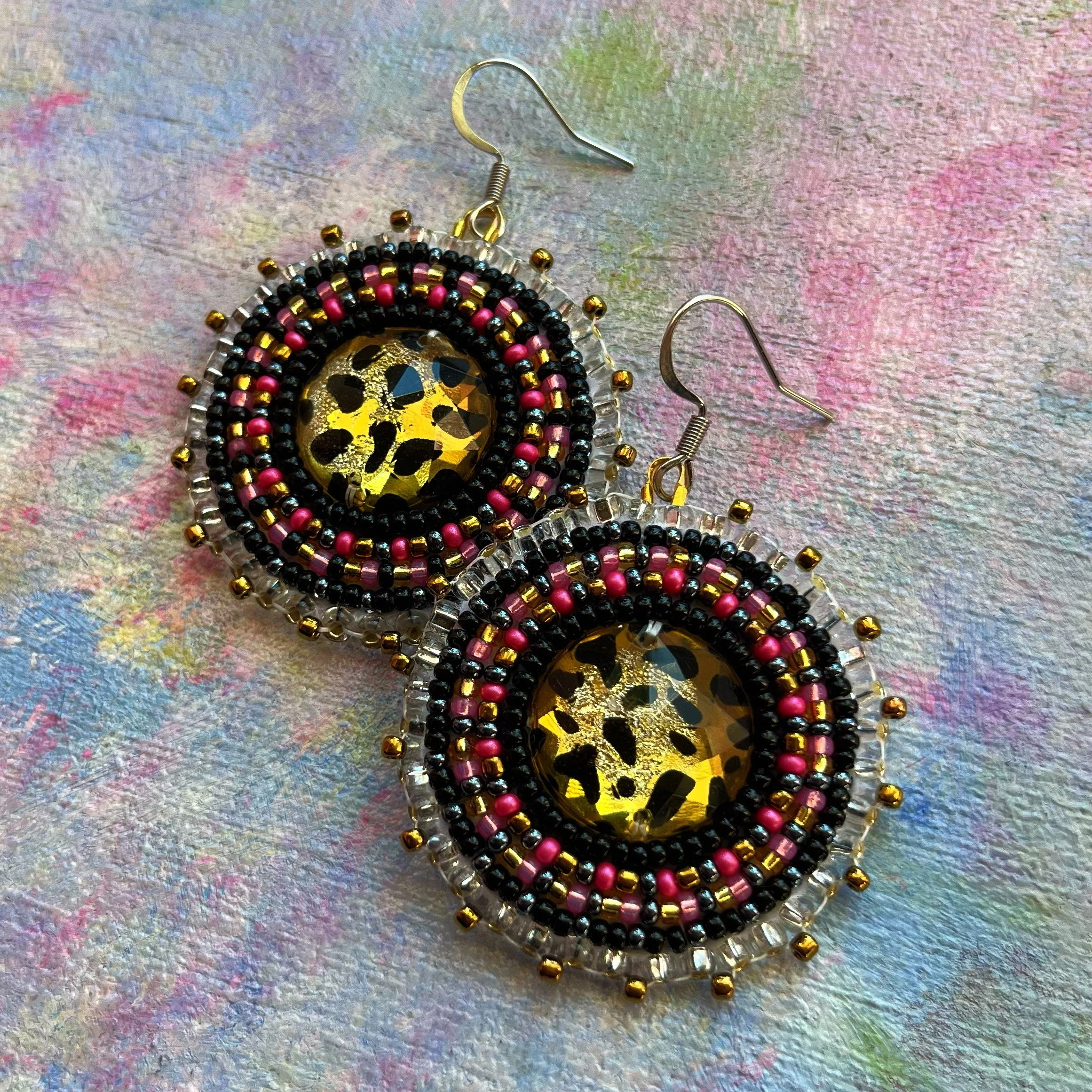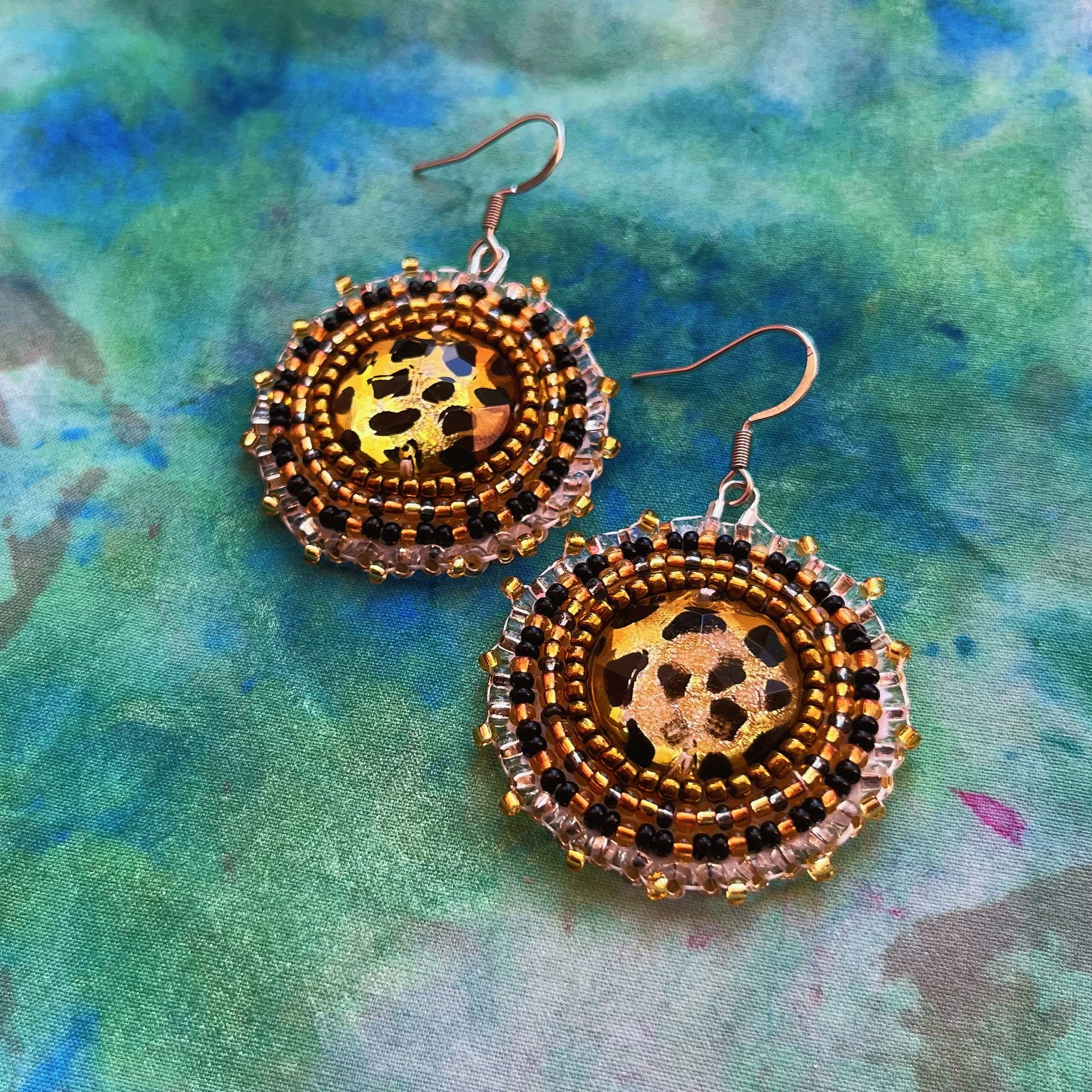 Beaded by hand with 11/0 glass seed beads and backed with white vinyl felt on hypoallergenic surgical steel hooks.
