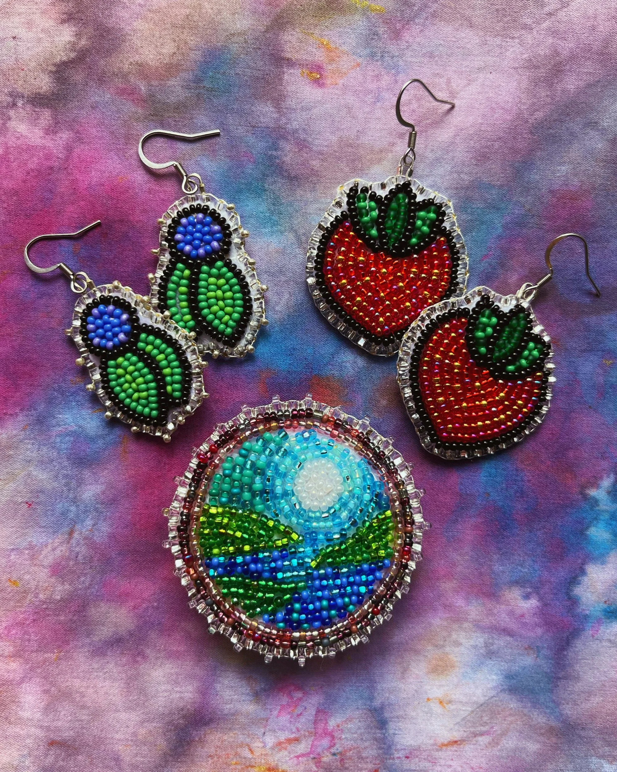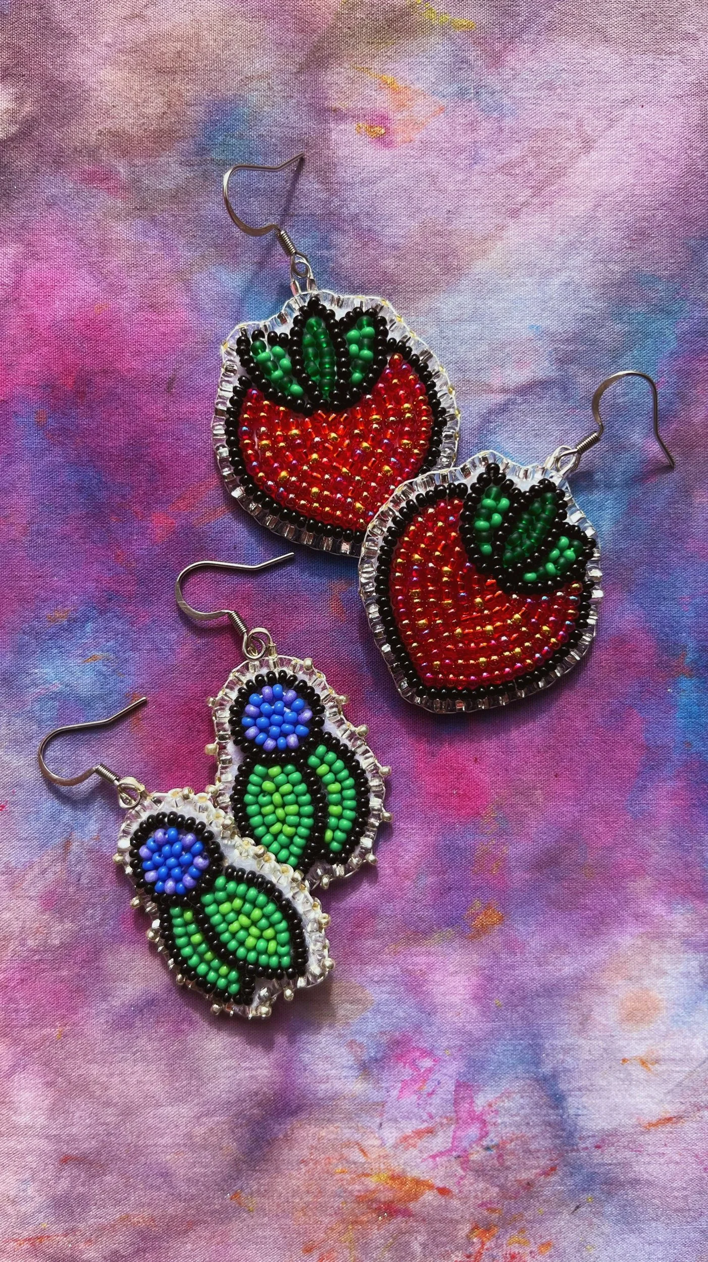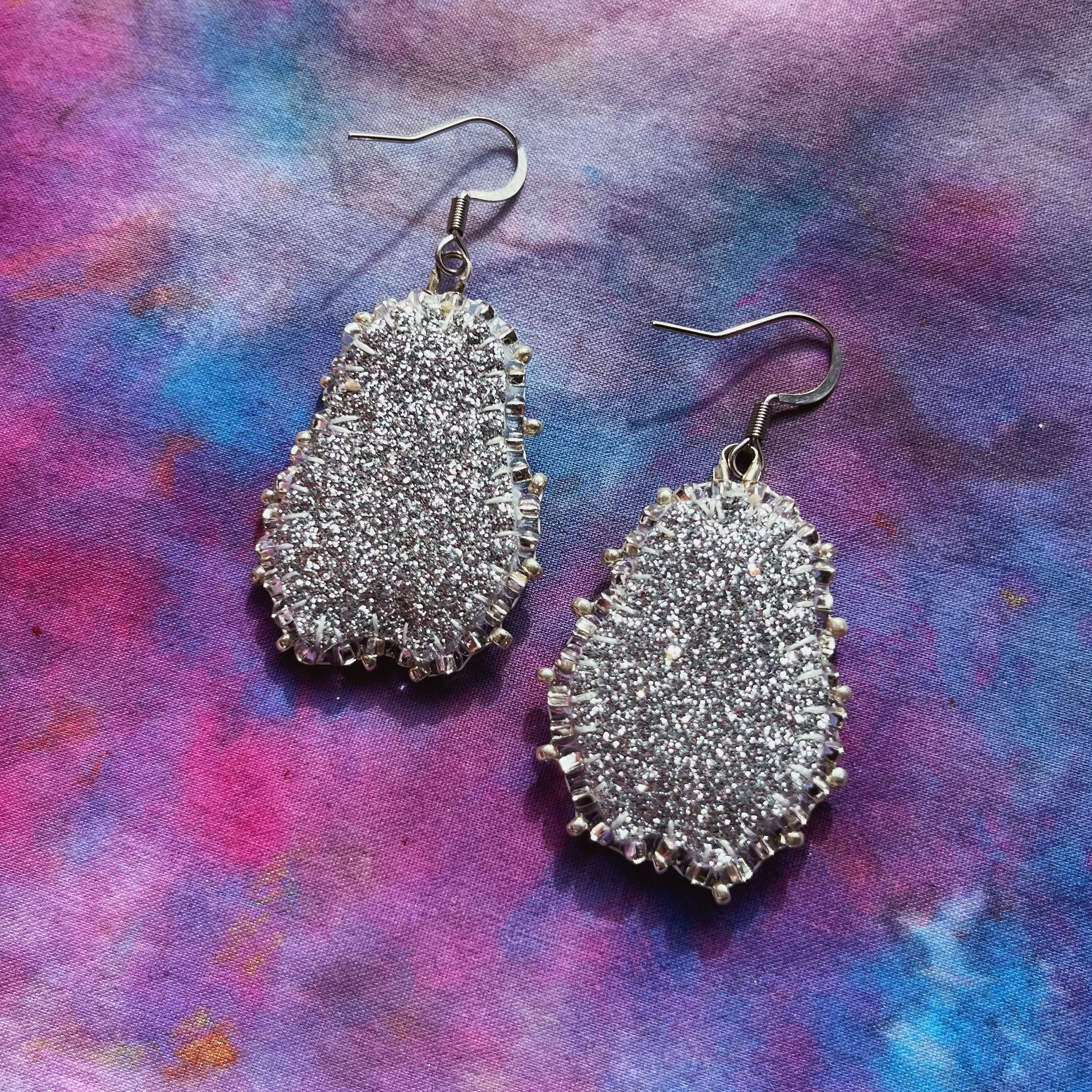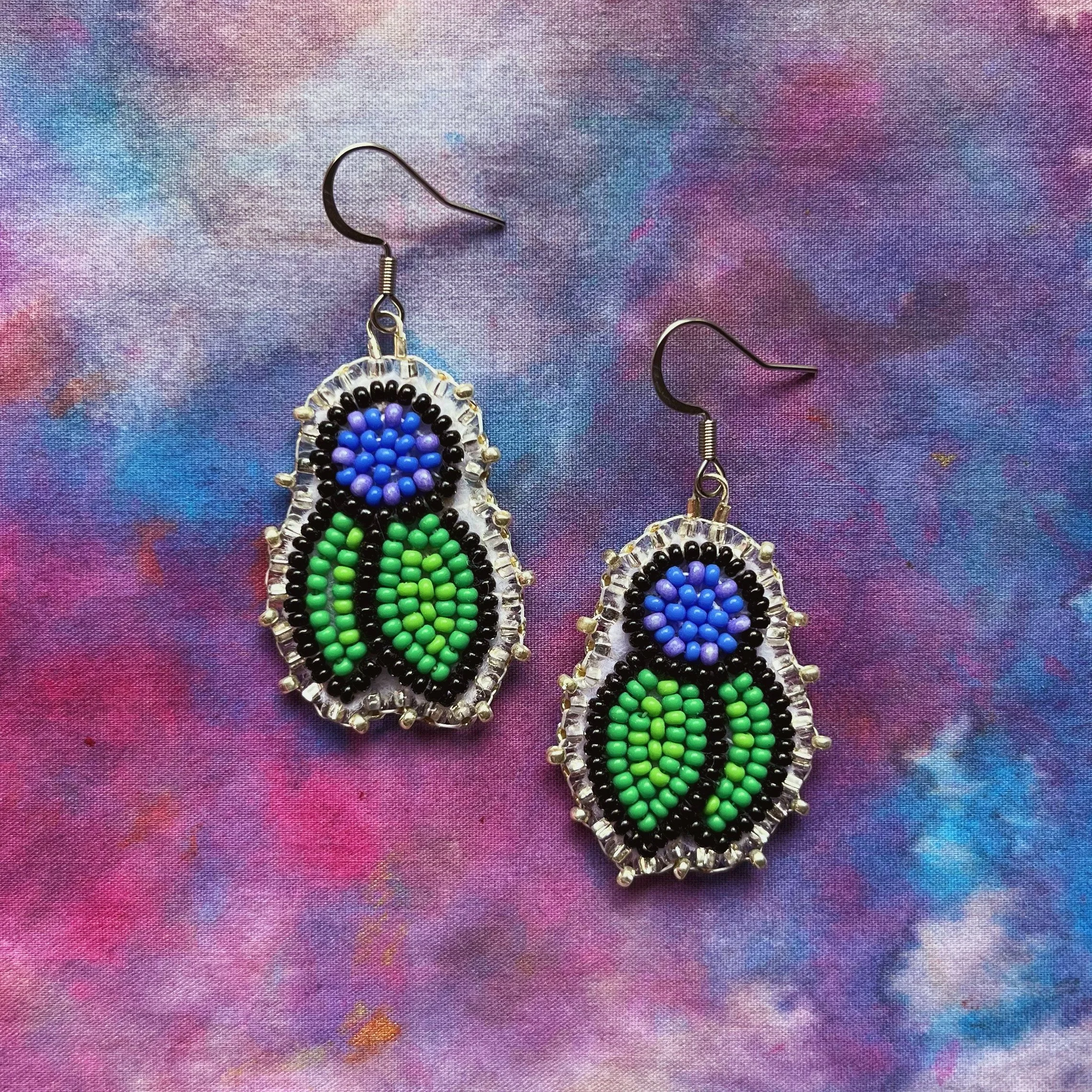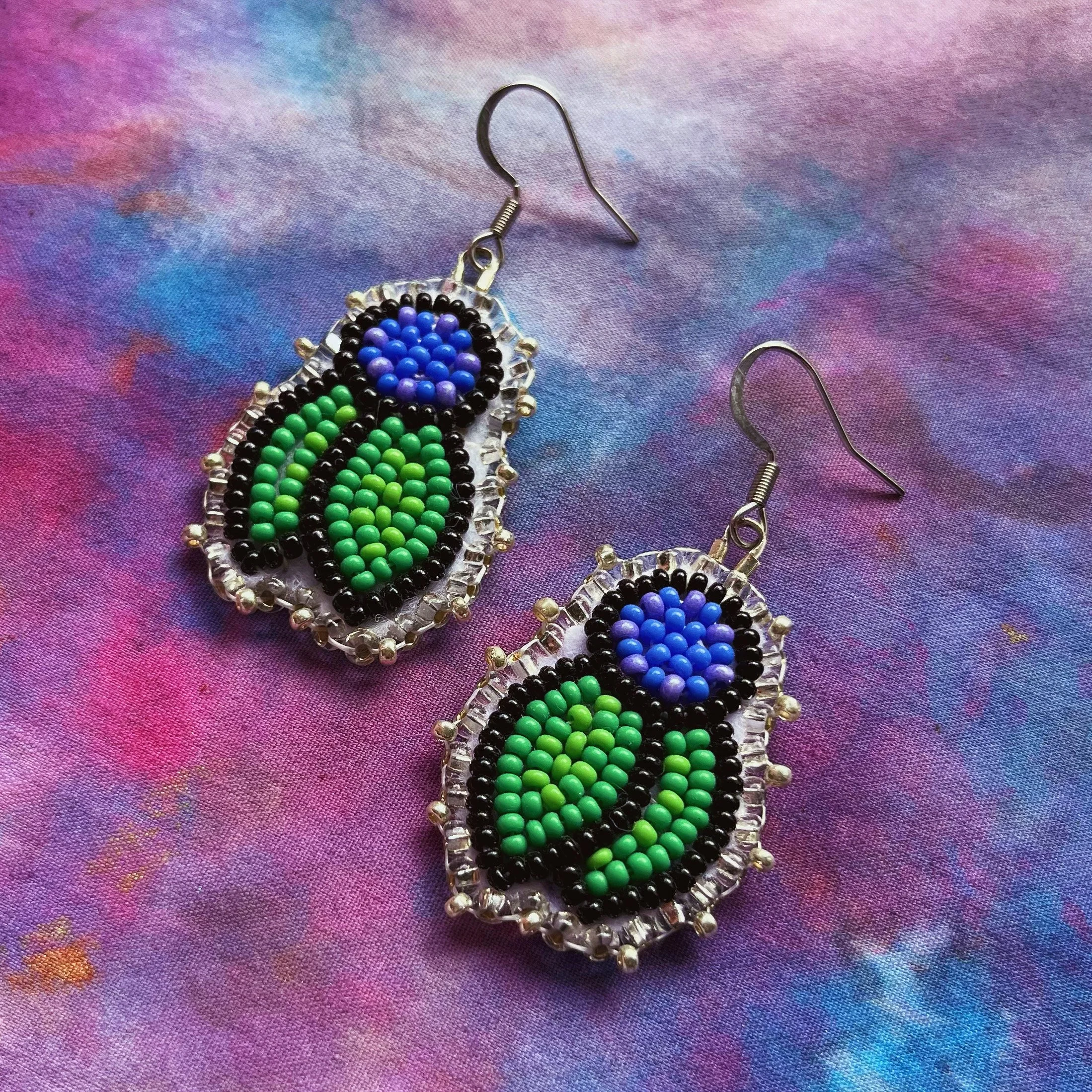 Beaded by hand with 11/0 glass seed beads and backed with glitter felt on hypoallergenic surgical steel hooks.